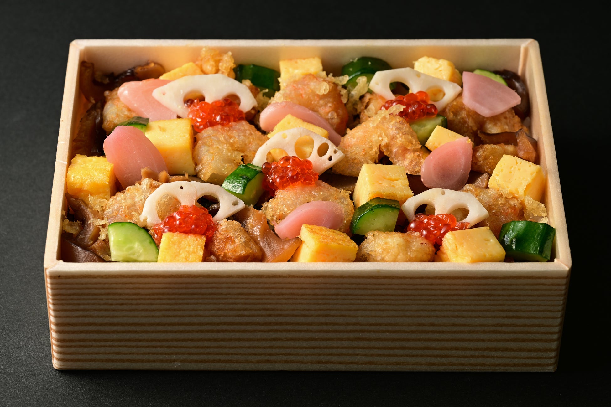 海老と小柱の天ぷら、そして輝くいくらを贅沢に盛り付けた一品。彩り鮮やかな見た目と、ひと口ごとに広がる至福の味わいをぜひお楽しみください。