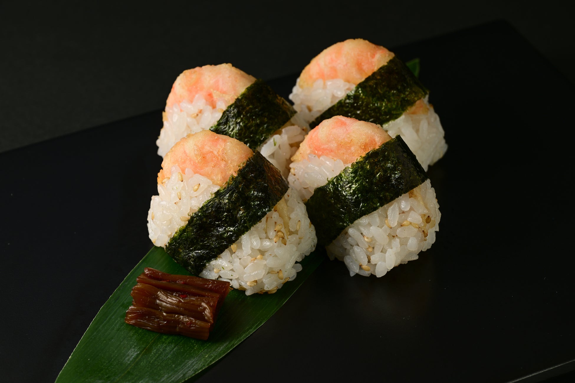 ぷりぷりの海老に、程よい塩味と煎り胡麻を合わせ、サッパリと仕上げた「天むす (白)」。秘伝の丼タレと甘味が特徴的なガリを絶妙なバランスで合わせた「天むす (黒)」。2種類の天むすをお好みに合わせてお買い求めください。