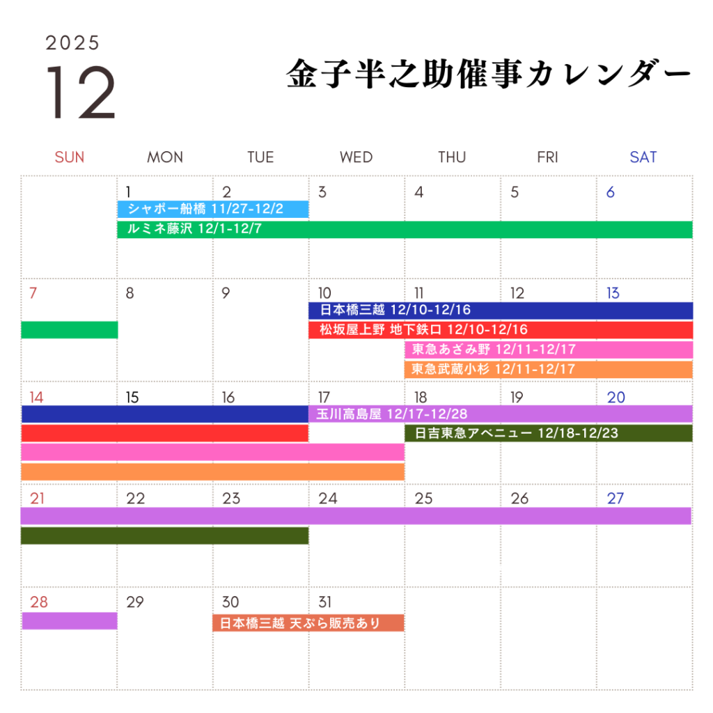 2025年12月度催事出店スケジュールのお知らせ 2025.12.01 INFO いつも日本橋 天丼 天むす 金子半之助をご愛好いただきありがとうございます。 12月は下記催事場にて販売を行います。 人気の江戸前天丼弁当や天むす、押し寿司等、是非お近くの催事場にてお買い求め下さい。 皆様のご来店心よりお待ちしております。 ※施設により休館日や営業時間変更の可能性がございます。詳しくは各施設までお問合せ下さい。