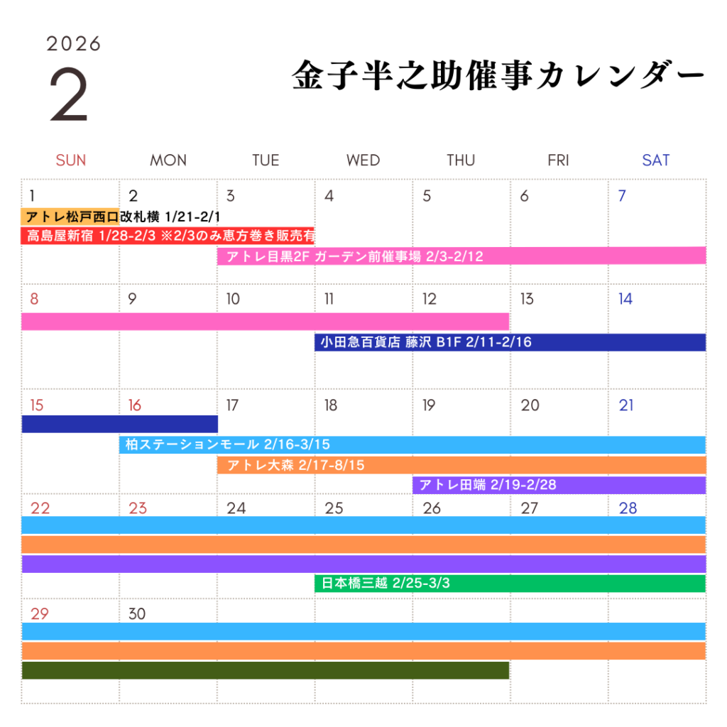 2026年2月度催事出店スケジュールのお知らせ 2026.01.29 INFO いつも日本橋 天丼 天むす 金子半之助をご愛好いただきありがとうございます。 2月は下記催事場にて販売を行います。 人気の江戸前天丼弁当や天むす、押し寿司等、是非お近くの催事場にてお買い求め下さい。 皆様のご来店心よりお待ちしております。 ※施設により休館日や営業時間変更の可能性がございます。詳しくは各施設までお問合せ下さい。